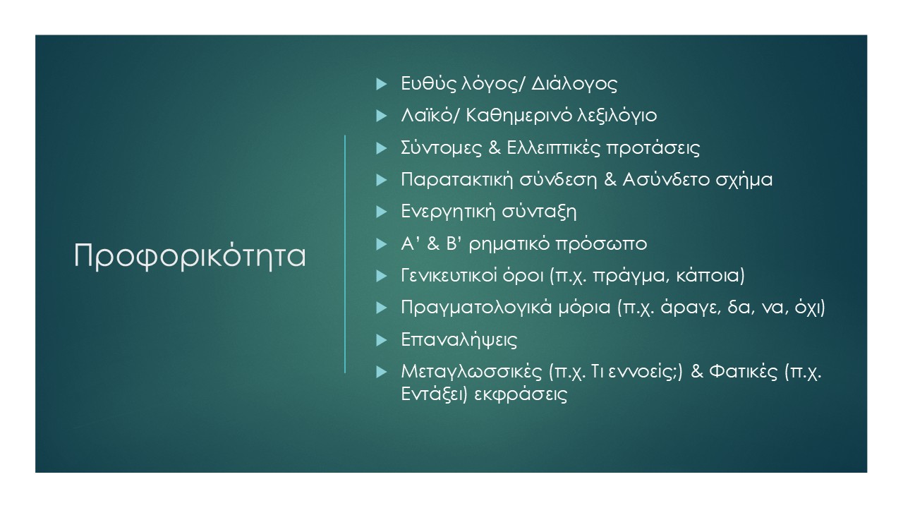 Ο προφορικός λόγος ως επικοινωνιακή δραστηριότητα χαρακτηρίζεται από την ταυτόχρονη παρουσία πομπού και δέκτη. Έτσι, ο λόγος συνοδεύεται από πλήθος παραγλωσσικών (ένταση της φωνής, επιτονισμός, ρυθμός κτλ.) αλλά και εξωγλωσσικών στοιχείων (εκφράσεις του προσώπου, κινήσεις του σώματος, βλέμματα, σιωπές κτλ.).