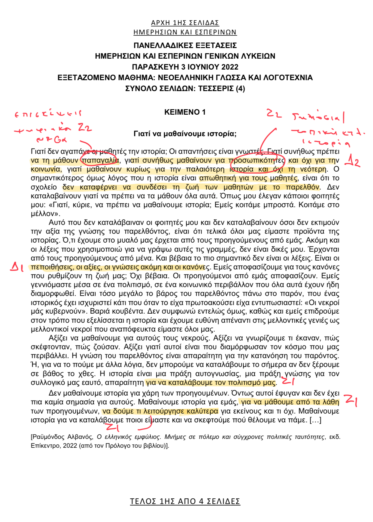 [Δ2] Παρ’ όλα αυτά, οι νέοι σήμερα φαίνεται να αγνοούν ή και να αμφισβητούν τη σημασία της είτε λόγω της μηχανιστικής διδασκαλίας της στην εκπαίδευση (απομνημόνευση, αδυναμία σύνδεσης με το παρόν και τις ανάγκες του, εμμονή στην πολεμική ιστορία κτλ.), αλλά και της γενικότερης απαξίωσης του πνευματικού πολιτισμού. [σύνδεση με Ζ2] Γι’ αυτό τον λόγο πρέπει αναζητήσουμε τρόπους για την αναθέρμανση του ενδιαφέροντος των νέων για το παρελθόν. (64 λέξεις)